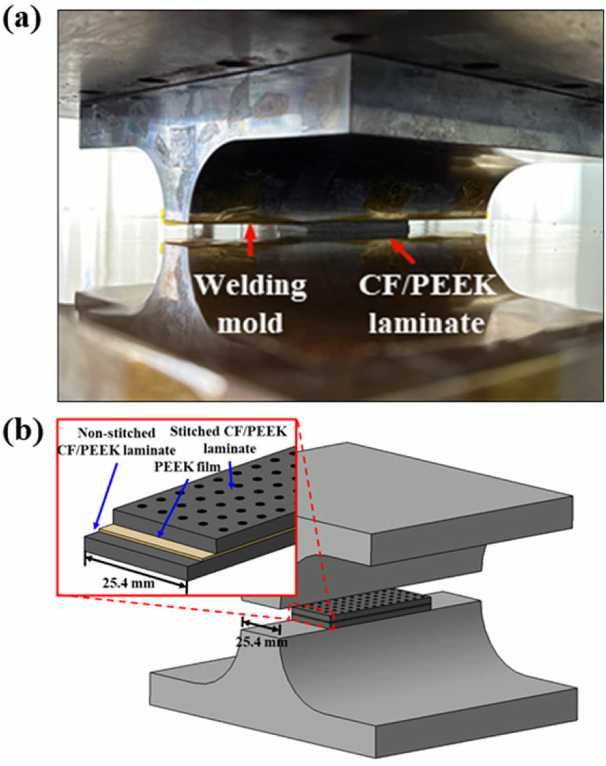 Fig. 5 (a) Heat conduction welding set up for CF/PEEK laminates and (b) Illustration of thermal conduction welding in which a PEEK film is inserted between two CF/PEEK laminates |