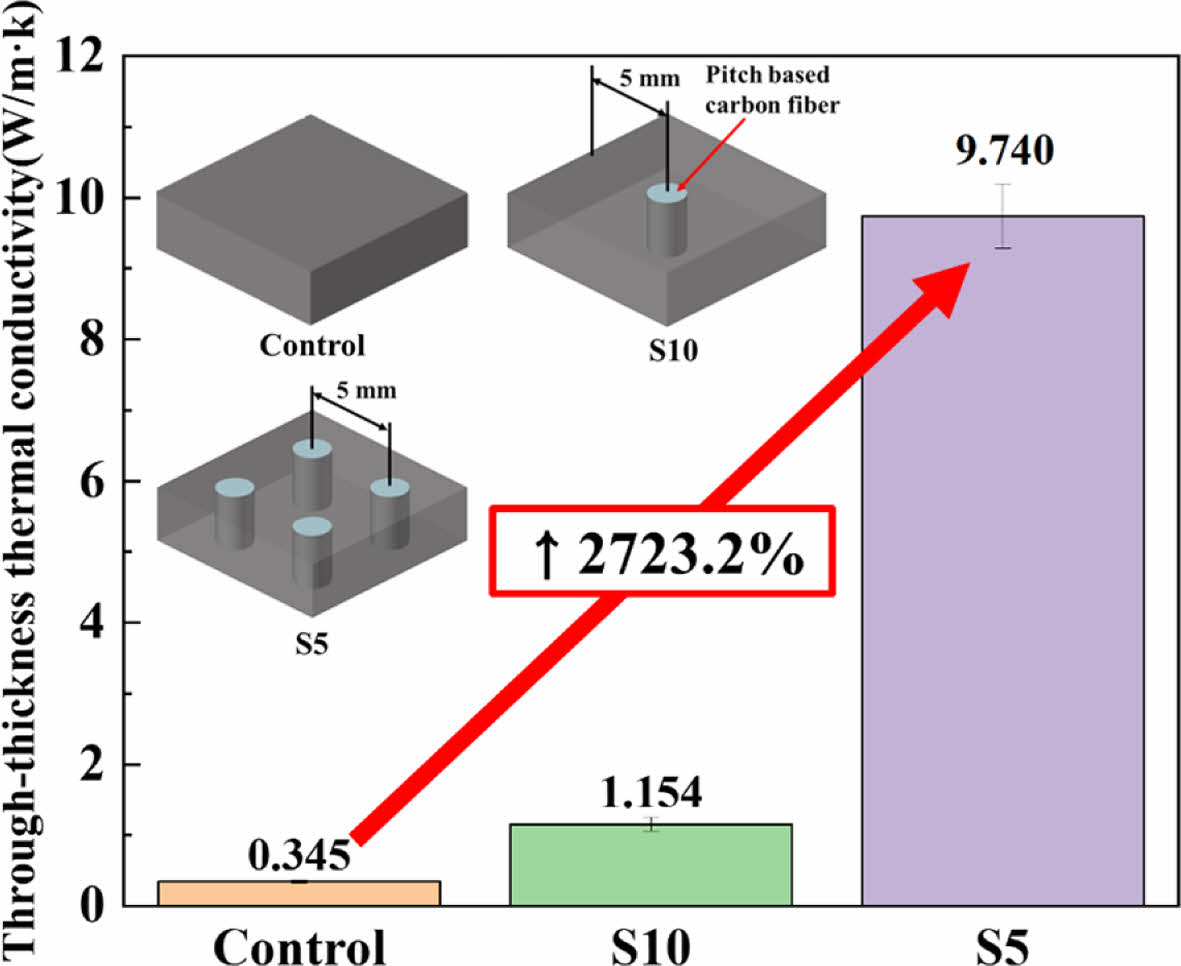 앞선 3.1절에서 언급한 바와 같이, 열전도도는 측정된 열확산도, 비열, 밀도를 바탕으로 계산되었다. Pitch계 탄소섬유 스티칭 밀도에 따른 열가소성 복합재의 열적 물성과 열전도도 측정 결과는 각각 Table 4과 Fig. 8에 각각 나타내었다. 측정 결과, Control 시편의 두께방향 열전도도는 0.345 W/m∙K, S10은 1.154 W/m∙K, S5 시편은 9.740 W/m∙K로 측정되어, 스티칭 밀도가 높아질수록 두께방향의 열전도도가 뚜렷하게 높아지는 경향을 확인할 수 있다. 특히, S5 시편은 Control 시편 대비 2,723.2% 열전도도가 향상되었으며, S10 시편의 843.9%의 값을 나타내었다.