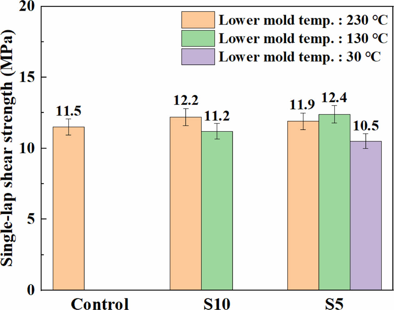 Fig. 11과 Table 5는 4.2 절에서 언급한 바와 같이, 하부 금형 온도를 각각 30oC, 130oC, 230oC로 설정하고 상부 금형 온도를 340oC에서 400oC로 변화시키며 열전도 용접을 수행한 Control, S10, S5 시편 중 접합이 이루어진 시편에 대해서 접합 강도를 평가하기 위해 단일 겹침 전단 강도를 측정한 결과를 나타낸 것이다. Control 시편은 하부 금형 온도가 230oC이고 상부 금형 온도가 380oC인 조건에서만 접합이 이루어졌으며, 접합 강도는 11.5 MPa로 측정되었다. S10 시편은 하부 금형 온도가 230oC, 상부 금형 온도가 370oC인 조건과 하부 금형 온도가 130oC, 상부 금형 온도가 380oC인 조건에서 접합이 이루어졌고 접합 강도는 각각 12.2 MPa, 11.2 MPa로 측정되었다. S5 시편은 모든 하부 금형 온도 조건에서 접합이 이루어졌으며, 하부 금형 온도가 230oC, 상부 금형 온도가 350oC인 조건에서는 접합 강도가 11.9 MPa, 하부 금형 온도가 130oC, 상부 금형 온도가 360oC 인 조건에서는 12.4 MPa이었으며, 하부 금형 온도가 30oC, 상부 금형 온도가 400oC 인 조건에서는 10.5 MPa로 측정되었다. 이러한 결과는 스티칭 밀도와 관계없이 접합이 이루어진 조건에서는 접합 강도가 대체로 유사한 수준으로 나타났으며, 시편 간 최대 차이는 1.9 MPa로 매우 작은 수준으로 나타났다. 이는 열전도 용접 과정 중 각 조건에서 접합 계면 온도가 약 343oC 수준으로 유지되어 스티칭 밀도에 따른 접합 계면의 온도 차이가 크지 않았기 때문으로 판단된다. 그러나 Pitch계 탄소섬유의 스티칭 밀도가 높을수록 상대적으로 낮은 상∙하부 금형 온도에서도 안정적인 열전도 용접이 가능하고, 동일한 수준의 접합 강도를 확보할 수 있음이 확인되었다.
