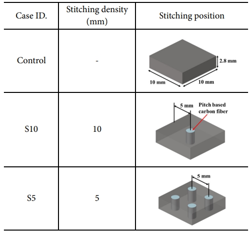 스티칭 공정은 적층 복합재의 낮은 층간 강도를 보완하기 위해 개발된 기술 중 하나로, 탄소섬유를 층간 방향으로 삽입하여 복합재의 층간 분리를 방지하고 충격 저항성을 높일 수 있다[30]. 본 연구에서는 스티칭에 사용되는 섬유를 열전도도가 매우 높은 Pitch계 탄소섬유를 사용하여 열전도 용접의 한계 및 성능을 극대화하였다.