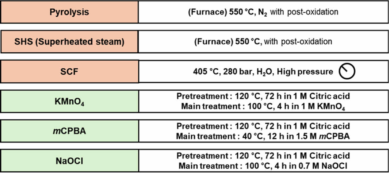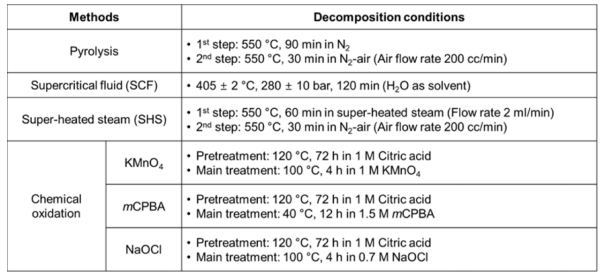 화학적 산화 방법에서는 산화제가 수지 내부로 침투할 수 있도록, CFRP를 1 M 구연산 용액에서 120°C로 72시간 동안 전처리하였다. KMnO4 산화는 1 M 과망간산칼륨 (KMnO4) 용액을 100°C에서 4시간 처리하여 EP 수지의 산화적 분해를 유도하였다. mCPBA 산화는 1.5 M 3-클로로과벤조산 (mCPBA) 용액을 40°C에서 12시간 동안 처리하여 비교적 온화한 조건에서 산화를 진행하였다. NaOCl 산화는 0.7 M 차아염소산나트륨 (NaOCl) 용액을 100°C에서 환류 조건으로 4시간 처리하여, 하이드록실 라디칼을 이용한 분해를 수행하였다. 모든 화학적 방법으로 처리된 재활용 탄소섬유 (r-CF)는 충분히 세척 및 건조되었다. 자세한 실험 방법과 분해 조건은 Table 1에 나타나 있다.