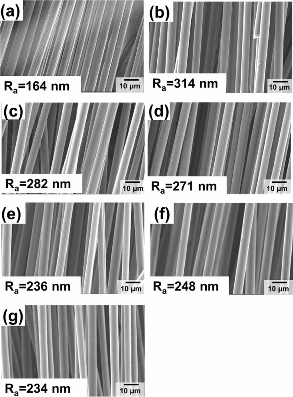 열처리 및 화학적 산화가 표면 미세구조에 미치는 영향을 평가하기 위해 AFM을 사용하여 산술 평균 조도 (Ra)를 측정하였다. Ra 값은 v-CF 대비, 산화 후 열분해 (Pyrolysis with post-oxidation)에서 191%, 초임계유체 (SCF)에서는 172%, 과열수증기 (SHS)에서는 165%, 화학적 산화 공정에서는 평균 146% 증가하였다. 가장 큰 표면 조도 증가는 열분해 공정에서 나타났으며, 이는 고온 및 고압 조건이 화학 산화보다 더 공격적인 식각 (etching)을 유도함을 나타낸다. 이러한 Ra의 증가는 CF 표면에 미세구조가 형성되었음을 의미하며, 이는 수지와의 기계적 결합력을 향상시킬 수 있다.