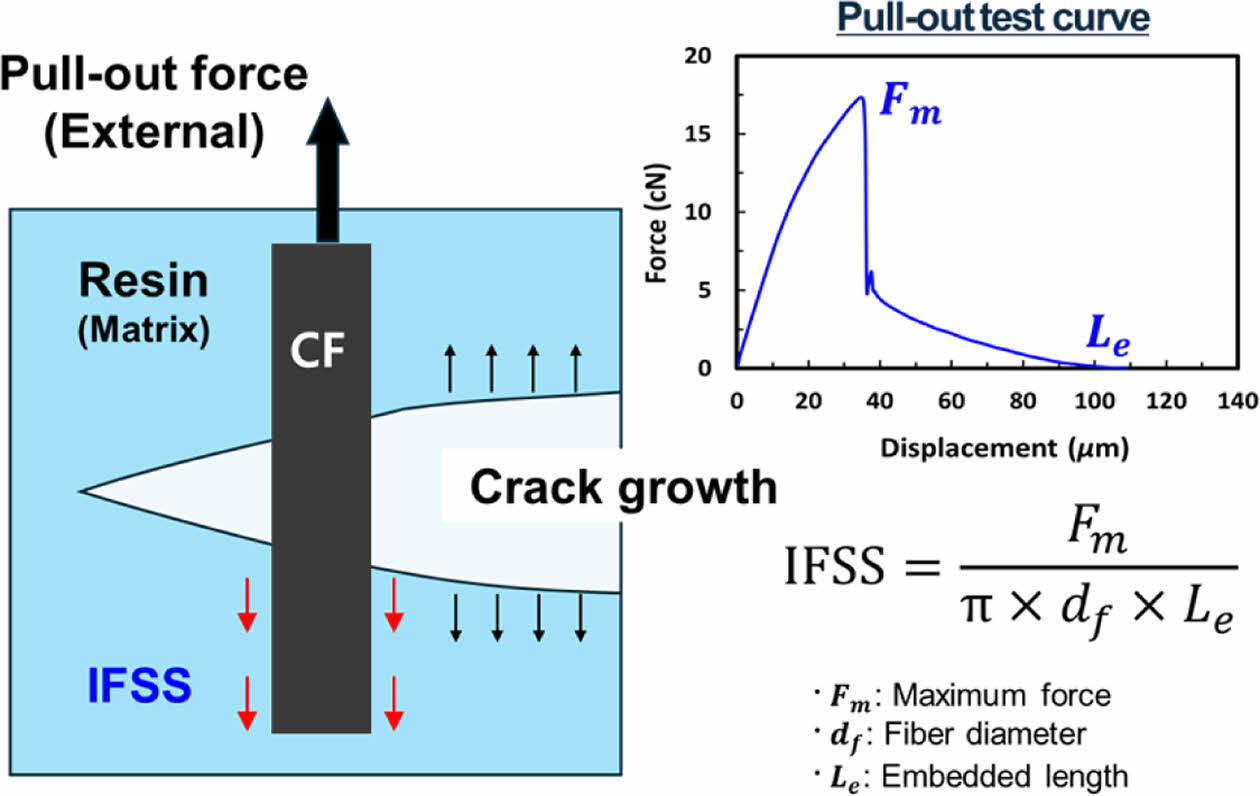 균열의 전파를 억제할 수 있는 정도는 일반적으로 계면 전단 강도 (Interfacial Shear Strength, IFSS)를 통해 평가된다. IFSS는 탄소섬유를 당겨서 빼낼 때 섬유가 저항하는 외부 힘을 나타내며, 고정된 길이의 섬유를 인발할 때 요구되는 최대 힘 (Fm)을 섬유의 표면적으로 나눈 값으로 정의된다 (Fig. 5).