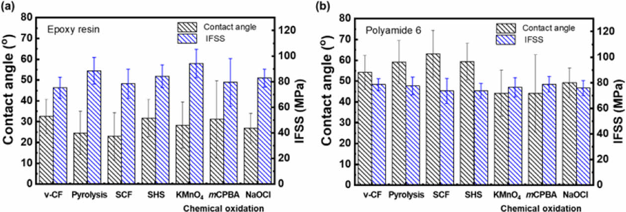 표면 조도가 가장 높고 (Ra=314 nm), 산소 함유 작용기(C–O 및 O=C–O) 비율이 가장 높은(37.7%) 열분해 처리 r-CF는 EP 수지와의 접촉각이 v-CF(32.9°)보다 크게 감소한 24.6°를 나타내었으며, 이에 따라 IFSS도 v-CF의 75.2 MPa에서 88.4 MPa로 증가하였다. 마찬가지로 SCF (Ra =282 nm, 작용기 28.95%) 및 SHS(Ra=271 nm, 작용기 24.8%) 처리 r-CF도 EP 수지와의 접촉각이 각각 22.6°, 31.7°로 낮았으며, 이는 표면 조도 증가와 극성 작용기의 존재가 상호작용하여 습윤성을 향상시켰음을 보여준다.