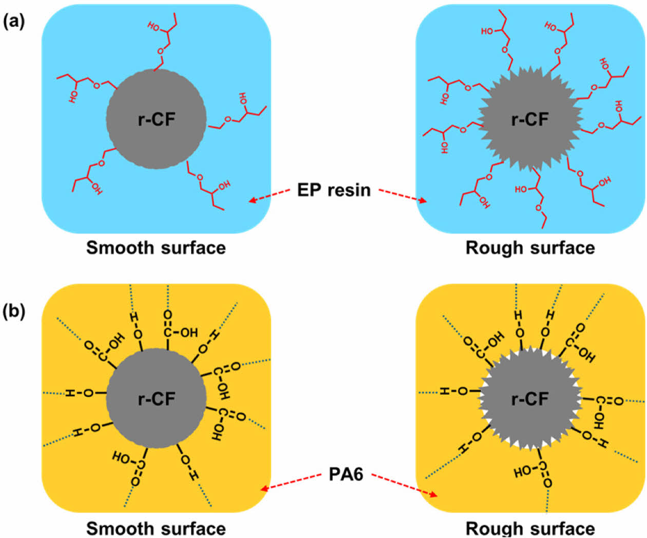 한편, PA6 수지는 r-CF의 작용기와 수소 결합을 형성하지만, 점도가 높아 표면 조도에 따라 침투 깊이가 제한될 수 있다. PA6는 표면 조도 증가에 의한 기계적 키 결합 효과는 제한적이지만, 극성 작용기를 통한 화학 결합은 여전히 접착에 기여할 수 있다.