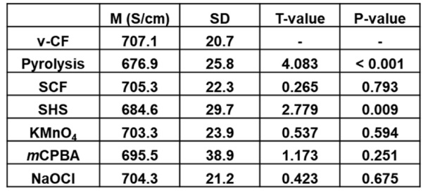 전기 전도도에서도 유사한 경향이 관찰되었다 (Fig. 4b, Table 5). 열분해 및 SHS 처리된 r-CF는 v-CF와 비교했을 때 전기 전도도에서 유의한 차이를 보였으나 (p <0.05), SCF, KMnO4, mCPBA, NaOCl로 처리된 r-CF는 통계적으로 유의미한 차이를 보이지 않았다 (p> 0.05). 이는 과도한 산화 및 열 분해가 기계적 특성뿐 아니라 전도성에도 부정적인 영향을 미친다는 것을 의미한다.