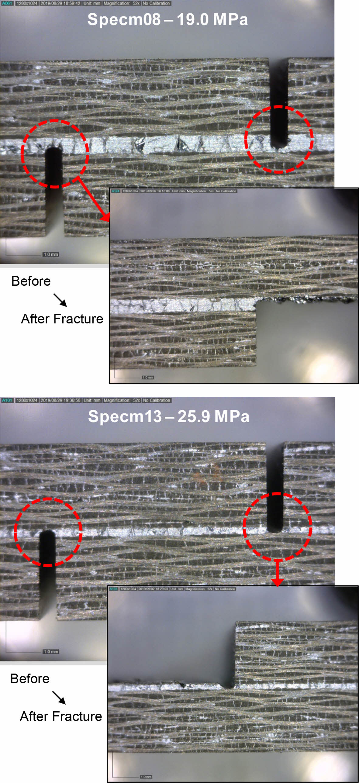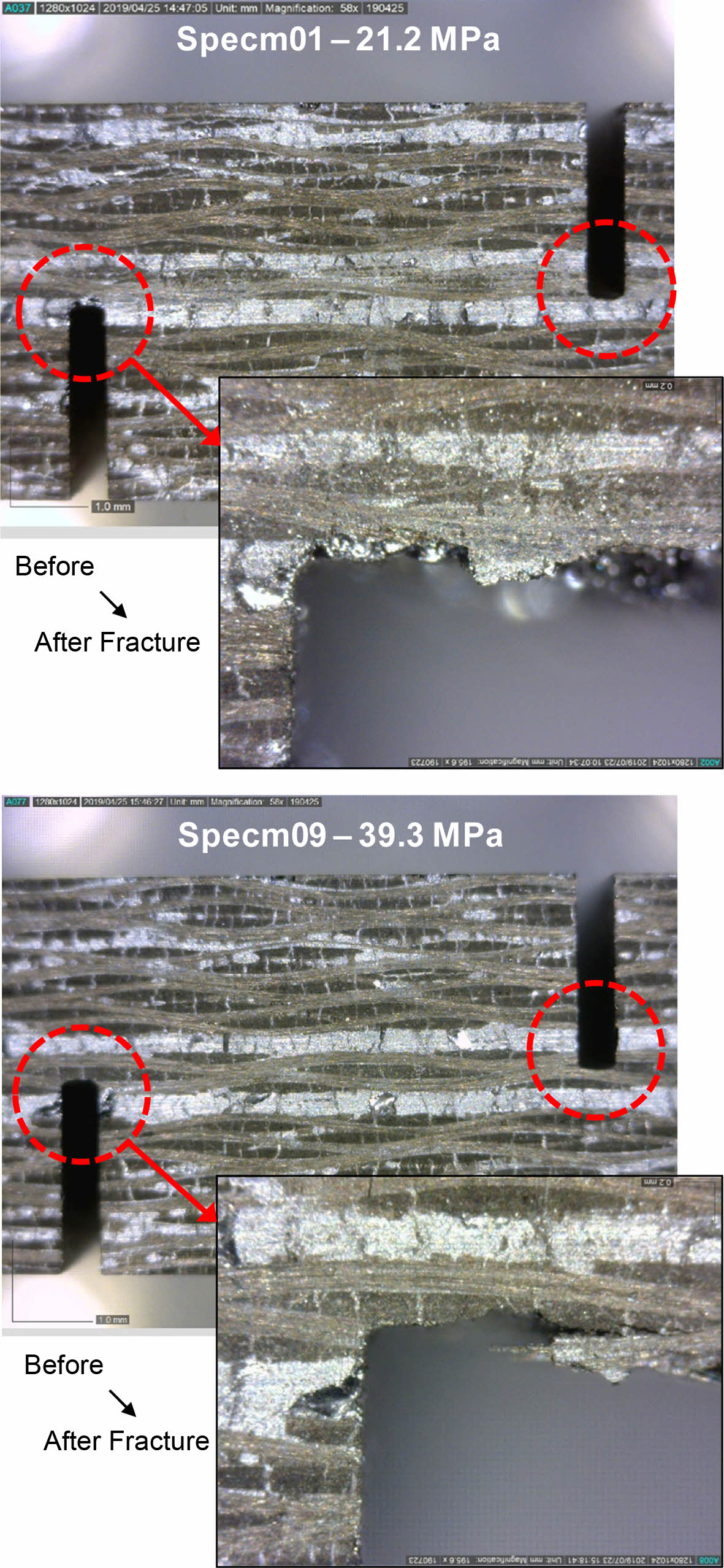 그 중 평균치와 유사한 값을 보인 5번 시편에서 시험 전/후로 파단부의 광학현미경 사진을 비교한 결과를 Fig. 4에 나타내었다. 가공된 노치 끝단에서 시작된 파손이 복합재료 적층면을 따라 진전되다가 이내 적층면의 수직으로 섬유 번들을 통과하는 균열이 형성되는 양상을 확인할 수 있다.