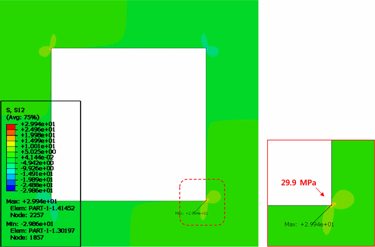 앞의 Fig. 3와 같이 구성한 내부 유로를 지니는 CMC 연소기 패널의 해석을 수행하여, 유로 모서리에서의 전단응력을 평가한 결과를 Fig. 8에 나타내었다. 해석 결과, 유로의 모서리 부분에서 최대 29.9 MPa의 매우 높은 응력집중을 확인할 수 있었다. 이는 본 해석모델에서는 모서리의 곡률을 모사하지 않았기 때문이며, 요소의 크기를 미세하게 부과함에 따라 모서리에서 비현실적으로 높은 응력 값이 도출된 것으로 판단된다.