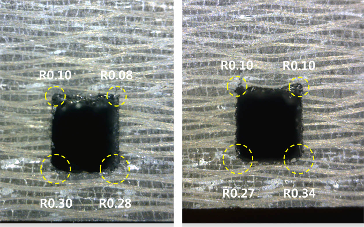 실제로 제작되는 CMC 연소기 패널의 내부유로는 가공 공구의 형상 및 성형공정 중 잔재하는 레진의 존재로 인해 상기 해석모델과 같이 곡률이 없는 완벽한 직각의 모서리를 형성하지 않는다. Fig. 9에서는 실제 제작된 내부 유로를 지니는 CMC 연소기 패널의 단면을 현미경으로 측정한 이미지를 나타낸다. 유로 바닥부분의 모서리는 가공 시 사용되는 치구의 형상에 의해 대략 R0.3mm의 곡률을 보이며, 유로 상부의 경우 이보다는 작은 R0.1mm 정도의 곡률을 보인다.