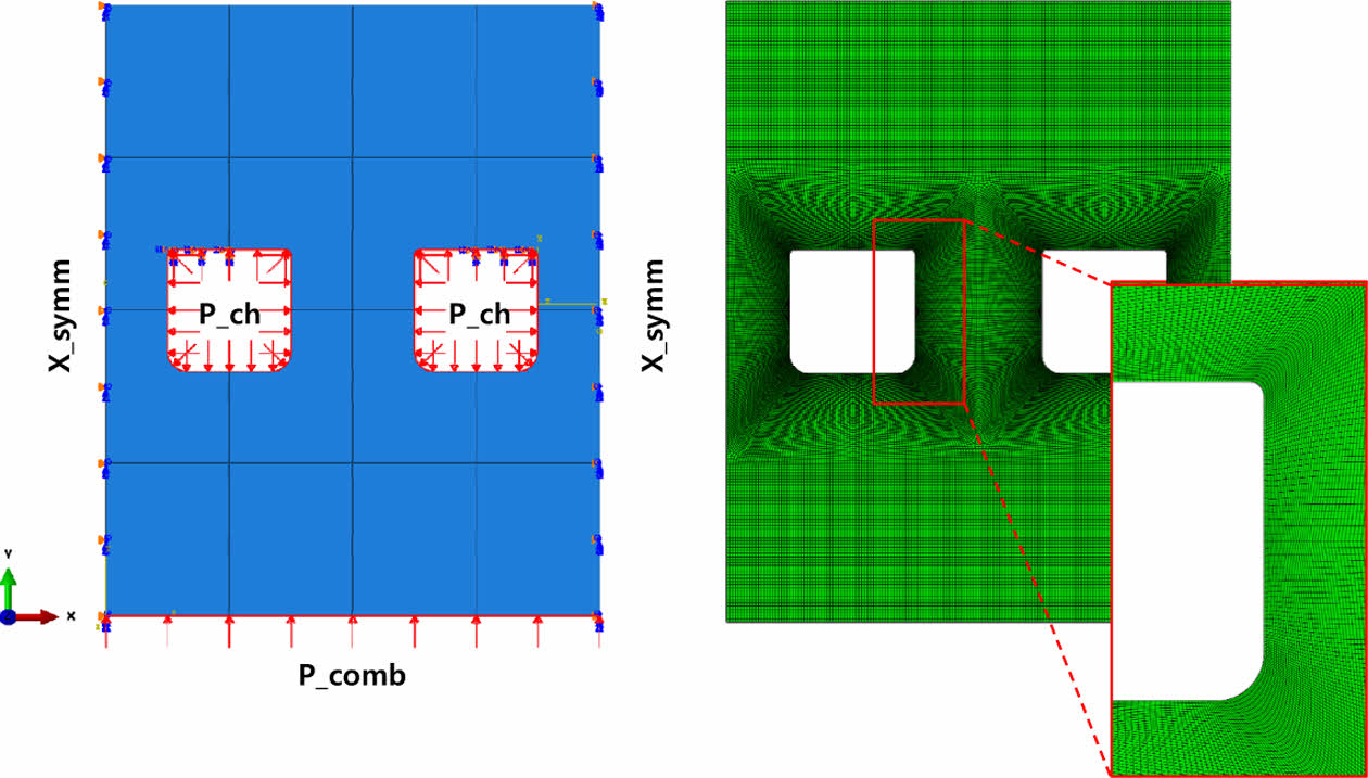 재생냉각 내부 유로의 구조안전성을 검증하기 위해, 아래 Fig. 3와 같이 CMC 연소기 패널의 내부 유로를 중심으로 유한요소 구조해석 모델을 구성하였다. 유로의 폭과 높이, 유로 옆면의 두께는 각 2 mm, 유로 상하면의 두께는 4 mm, 패널 단면의 총 두께는 10 mm로 가정하였다.