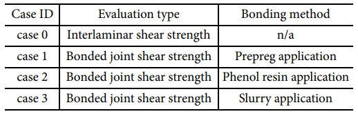 CMC 내부 유로의 개조도를 나타낸 Fig. 1에서 볼 수 있듯이, 유로의 하단 모서리에서 전단하중에 의한 파손 여부를 가늠하기 위해서는 C/SiC 소재의 층간전단강도를 평가하여야 한다. 반면 유로 상부 모서리는 접합부로 형성되기 때문에, 이 영역의 파손 여부를 확인하기 위해 접합부의 전단강도를 평가하여야 한다. 접합부 강도 평가의 경우, 서로 다른 접합 방법에 의한 영향을 파악하기 위해 2.1장에서 설명한 바와 같이 3가지의 서로 다른 접합 방법을 적용한 경우에 대해 각각 시편을 제작하였다. 각 시편의 case들에 대한 정의 및 평가 유형은 Table 1에 정리하였다.