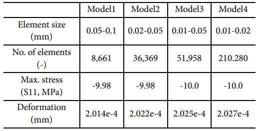 해석코드는 ABAQUS를 사용하였으며, 4-node plane strain 사각요소를 적용하였다. 해석모델에 사용된 요소 수를 결정하기 위해 Table 2와 같이 요소의 크기와 응력 결과에 대한 적합성 평가를 수행하였다. 그 결과를 바탕으로 요소의 크기를 최소 0.01 mm에서 최대 0.05 mm로 결정하였으며 (총 요소 수 51,958개), 유로 내부 벽면 및 모서리 영역에 더 조밀한 요소망을 구성하였다.