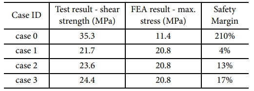 유한요소 해석 결과, 유로 하부 모서리에서는 최대 전단응력이 11.4 MPa, 상부 접합부에서는 20.8 MPa로 산출되었다. 층간전단 하중을 받는 유로 하부 모서리의 경우 2배에 가까운 충분한 안전율을 확보 가능하다. 그러나 접합부 전단하중을 받는 유로 상부 모서리의 경우, 시험 결과의 편차를 감안하면 case 3가 안전율 기준을 충족할 가능성이 높음을 알 수 있다. 따라서 C/SiC 구조체의 접합 설계 시 슬러리 기반의 균일한 접합부 형성이 가장 효과적인 구조 안정성 확보 방안임을 확인하였다.