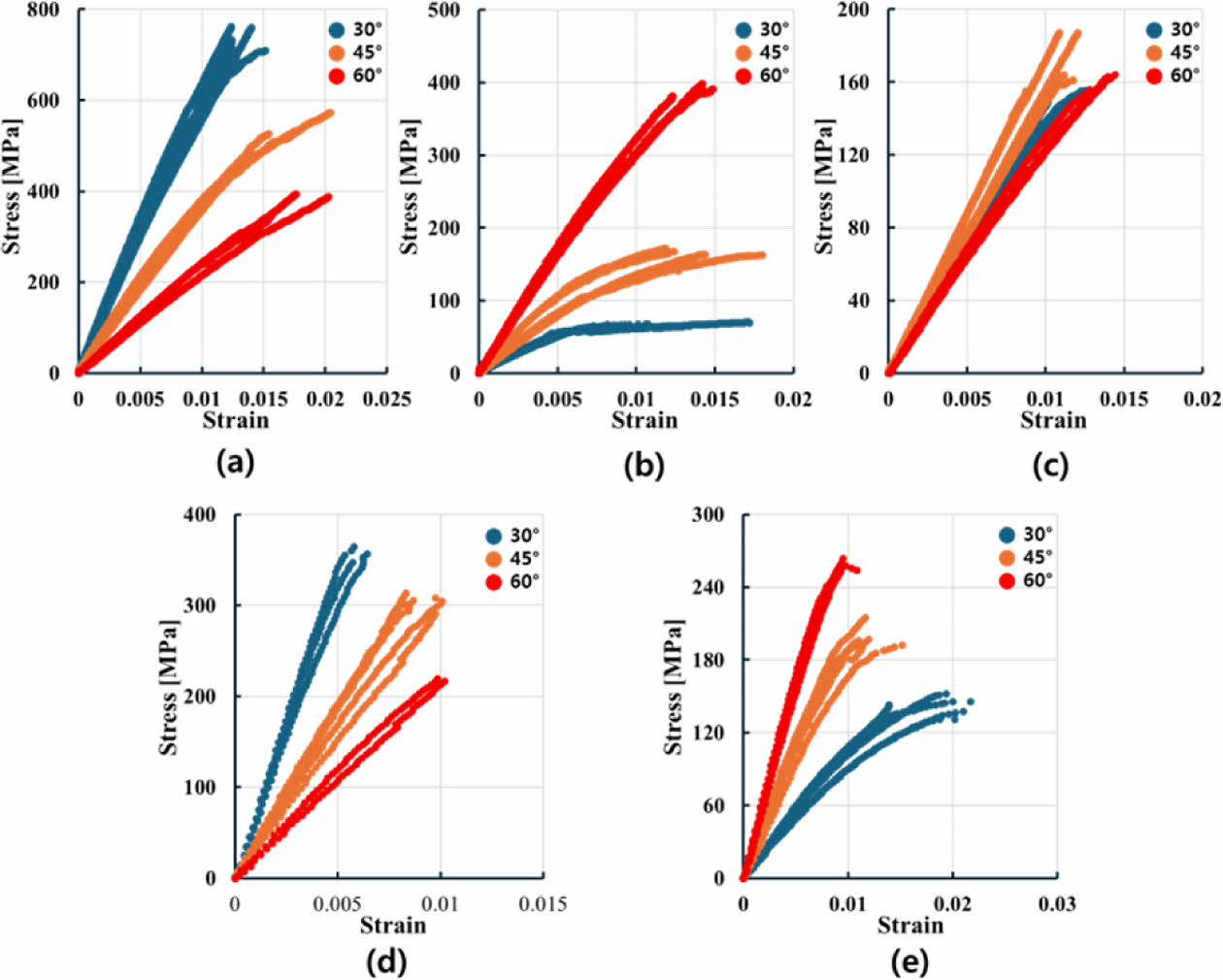 브레이딩 각도에 따른 기계적 물성 변화를 정량화하기 위해 인장 및 전단 시험을 수행하였다. 모든 시험은 Instron 5982 만능 시험기 (최대 하중 100kN)을 사용하였으며, 하중 속도는 2 mm/min으로 설정하였다. 또한 시험 중 변형률은 스트레인 게이지를 통해 측정되었다. 동일 조건에서 각각 5회의 반복 시험을 통해 물성 (E1, E2, G12, Xt, Xc, Yt, Yc, S)을 측정하였다. 해당 실험에서 얻은 응력-변형률 곡선은 Fig. 2에 제시하였고, 정량화된 결과는 Table 1에서 평균 ± 표준편차의 형식으로 정리되었다.