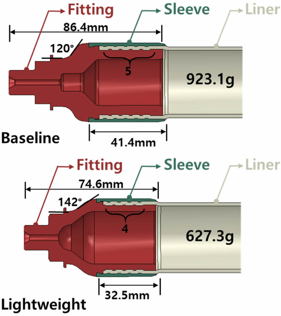 브레이딩 복합재 기반 Type IV 수소압력용기의 경량화 설계가 구조 성능에 미치는 영향을 정량적으로 분석하기 위해 유한요소해석을 수행하였다. 해석 대상은 Fig. 3과 같이 기존 모델(Baseline model)과 피팅 및 슬리브 형상을 단순화하여 중량을 약 32% 절감한 경량화 설계 모델(Lightweight model)이다. 두 모델은 동일한 라이너 및 복합재 외피 구조를 기반으로 차이는 피팅과 슬리브 형상에 국한된다.