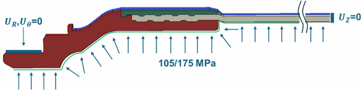 본 연구에서는 파열 시험 조건과 일치하는 경계 조건 및 설계 기준 기반의 내압 조건을 모델에 적용하였다. 경계 조건은 Fig. 7와 같이 실제 파열 시험의 체결 조건을 정밀하게 반영하였다. 상단 밸브 체결부에 대해 반경 방향(UR) 및 회전 방향(Uθ) 변위를 고정하였다. 축 방향 절단면은 면 대칭 조건으로 Uz = 0을 적용하였다.