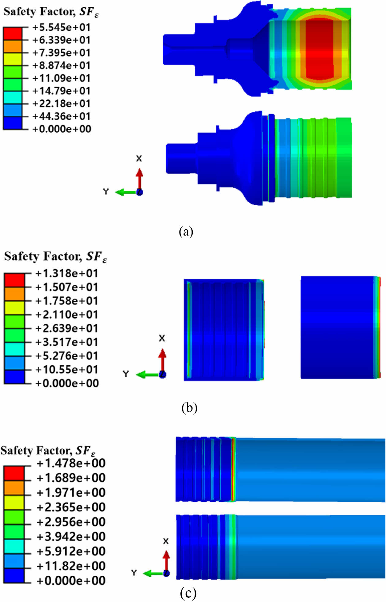 Fig. 9 Safety Factor contour at 157.5 MPa (Baseline model): (a) Fitting, (b) Sleeve, (c) Liner |