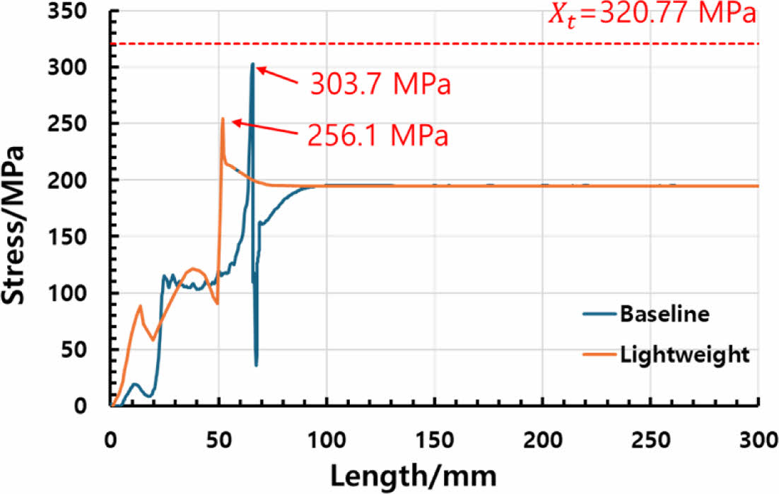 복합재 외피에 대한 구조 안정성 평가는 축방향(1-dir.)과 hoop 방향(2-dir.)의 두 응력 성분에 대해 각각 진행하였다. 전단 응력 성분은 해석 결과에서 매우 낮은 값을 보여 구조 안정성에 끼치는 영향이 미미한 것으로 판단되어 방향별 구조 안전성 평가에서 제외하였다. 분석 결과는 Fig. 11~12에 도시되어 있으며, 이는 최소 파열압 조건(157.5 MPa) 하에서 외피 표면을 따라 측정된 축방향 및 hoop 응력의 길이 방향 분포를 나타낸다. 두 그림에는 Baseline 및 Lightweight 모델 각각에 대한 응력 분포가 포함되어 있어, 응력 집중의 위치와 크기를 정량적으로 비교할 수 있다.