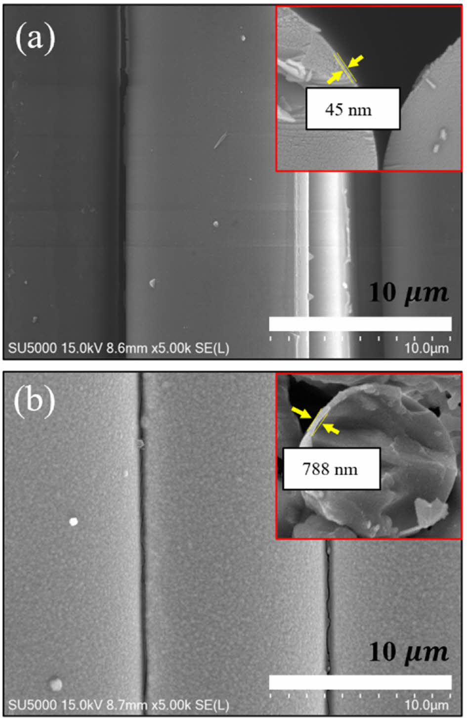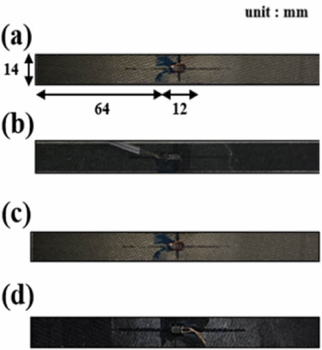 수분 흡수가 시편의 미세 구조에 미치는 영향을 확인하기 위해, Fig. 15에 나타난 바와 같이 시편의 표면과 단면의 SEM 이미지를 촬영하였다. 그러나 수분이 포함되어 있는 시편의 SEM 이미지 촬영이 제한되기 때문에 시편은 항온항습기에서 50%의 상대습도, 23oC의 환경에서 24시간이 넘지 않도록 안정화 과정을 진행하였다. SEM 이미지 분석 결과, 수분 흡수 후 유전체용 NCF 시편의 표면에서 미세 균열이 발생하였으며 GND용 NCF 시편은 미세 공극과 균열이 발생하지 않았다. 이러한 결과는 유전체용 NCF 시편과 GND용 NCF 시편의 고온다습한 환경에서 시험 전, 후 기계적 물성 거동에서 다른 경향을 만들어 냈다.