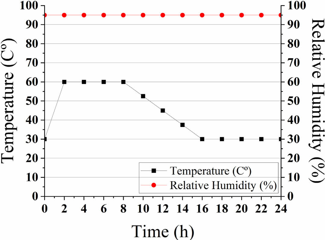 Fig. 5 Temperature and RH profile for the 24 h hygrothermal test cycle |