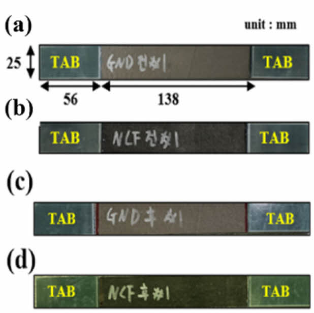 니켈이 무전해도금된 유리섬유/에폭시 복합재의 인장, 압축 시험을 수행하여, 환경시험 전, 후로 수분이 복합재에 미치는 영향과 계면 결합력에 미치는 영향을 확인하였다. 기계적 특성을 비교하기 위해 GND용 NCF와 유전체용 NCF 두 종류의 시편을 가공 및 제작하였으며 시편 형상은 Fig. 6, Fig. 7와 같다.