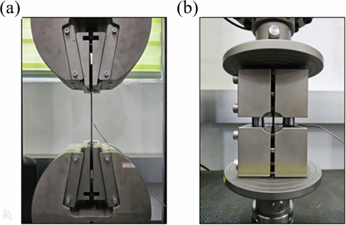 Fig. 8 Mechanical test setups: (a) Tensile test, (b) compressive test |