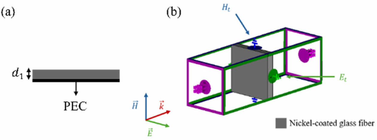 본 연구에서는 NCF 흡수층과 후면에는 GND용 NCF로 구성된 단층형 달렌바흐 흡수체를 Fig. 12(a)와 같이 설계하였다. 전자기파가 RAS에 입사하면, 일부는 표면에서 반사되고, 다른 일부는 유전체용 NCF를 통해 전달된다. 전달된 전자기파 중 일부는 열에너지로 변환되고 나머지는 후면의 GND용 NCF로부터 반사된다. 이때 전달되는 전자기파는 표면 반사파와 서로 공명현상을 일으켜 전자기파를 상쇄시킨다[29].
