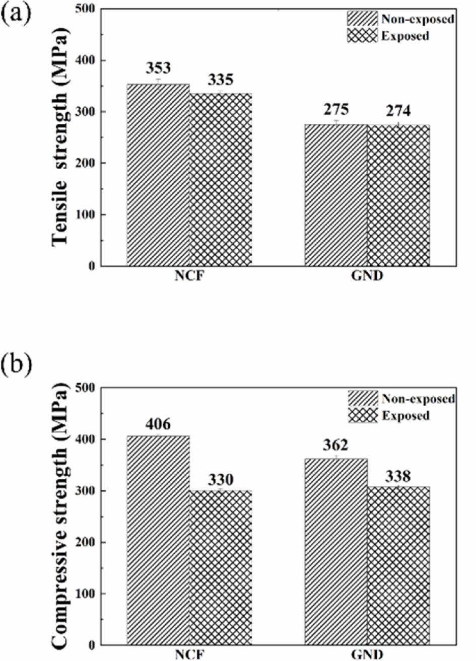 Fig. 16 Comparison of mechanical characteristics of the NCF and GND before and after moisture absorption: (a) Tensile strength and (b) Compressive strength |