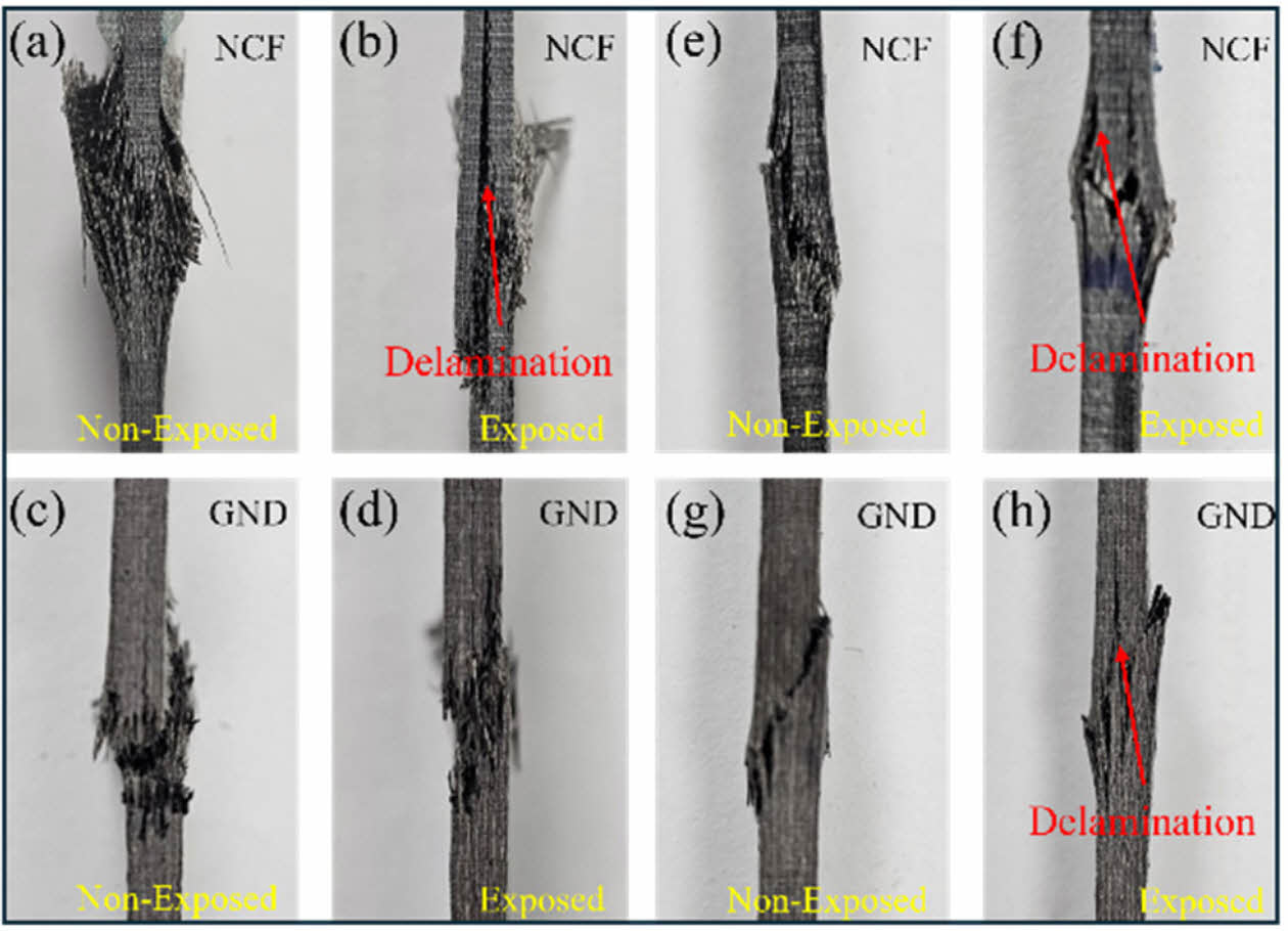 인장시험의 경우 내환경 시험 전 유전체용 NCF 시편은 그립부 인근에서 섬유 다발이 급격히 분출하며 파단되는 폭발적 빗자루형 파괴를 나타냈다. 반면 내환경 시험 후 유전체용 NCF 시편에는 시편 게이지 영역 전반에 걸쳐 층간 박리와 섬유 인발이 우세한 파괴로 전이되어, 섬유보다는 층간 접착력 저하가 파괴를 지배함이 확인되었다. GND용 NCF 시편은 내환경 시험 전, 후 모두 섬유 방향의 세로 분열형 파괴가 기본적으로 유지되었으나, 처리 후 시편에서는 섬유 인발 길이 증가와 박리 면적 확대가 두드러졌다. 압축 시험의 경우 내환경 시험 전 유전체용 NCF는 국부적 섬유 미세 좌굴과 소규모 측면 부풀림을 보였으나, 내환경 시험 후 층간 분리 확산 및 섬유 인발로 계면 전단강도 저하와 매트릭스 연화가 파괴를 지배했다. 반면 GND용 NCF는 처리 전후 모두 섬유 좌굴 지배 파괴 양상이었으나, 처리 후 빗자루형 분열과 다중 층간 분리 및 길이 방향 섬유 인발이 확대되었다. 이는 계면 열화 및 매트릭스 연화가 섬유 지배 파괴를 계면 및 매트릭스 지배 파괴로 전환시켜 압축 강도를 현저히 감소시킨 결과이다.