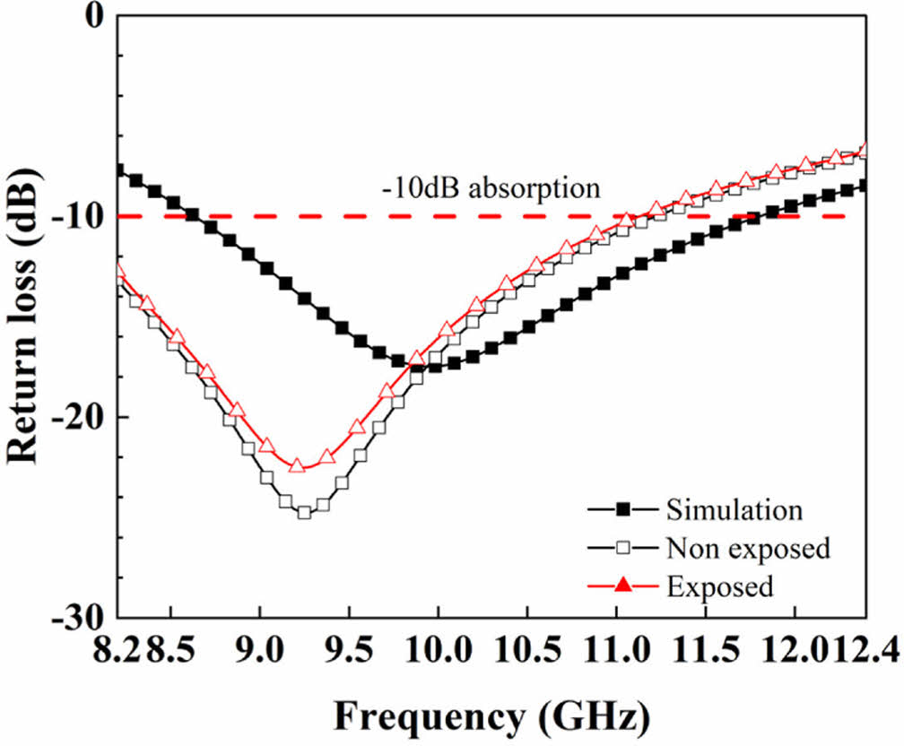 Fig. 12(b)은 상용소프트웨어인 CST Microwave Studio로 설계한 단층형 전파흡수체의 단위 셀 모델이다. RAS는 본 연구에서 측정한 주파수 대역에서 높은 흡수 성능을 나타내도록 두께에 대한 최적화를 통해 RAS를 설계하였으며 이 때 유전체용 NCF 층의 두께는(d1) 2.9 mm로 도출되었다. 이의 시뮬레이션 결과는 Fig. 13에 나타내었다.