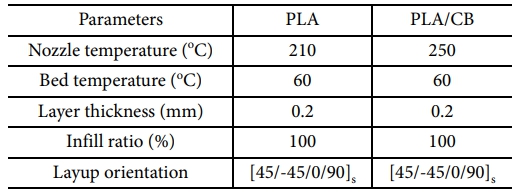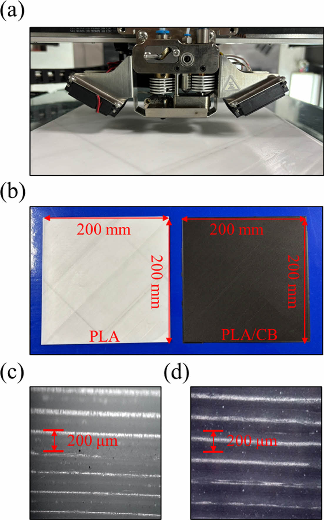 Fig. 3 (a) 3D-Printing fabrication of specimen, (b) 3D-Printed specimen, cross section of the specimen (c) PLA, (d) PLA/ CB |