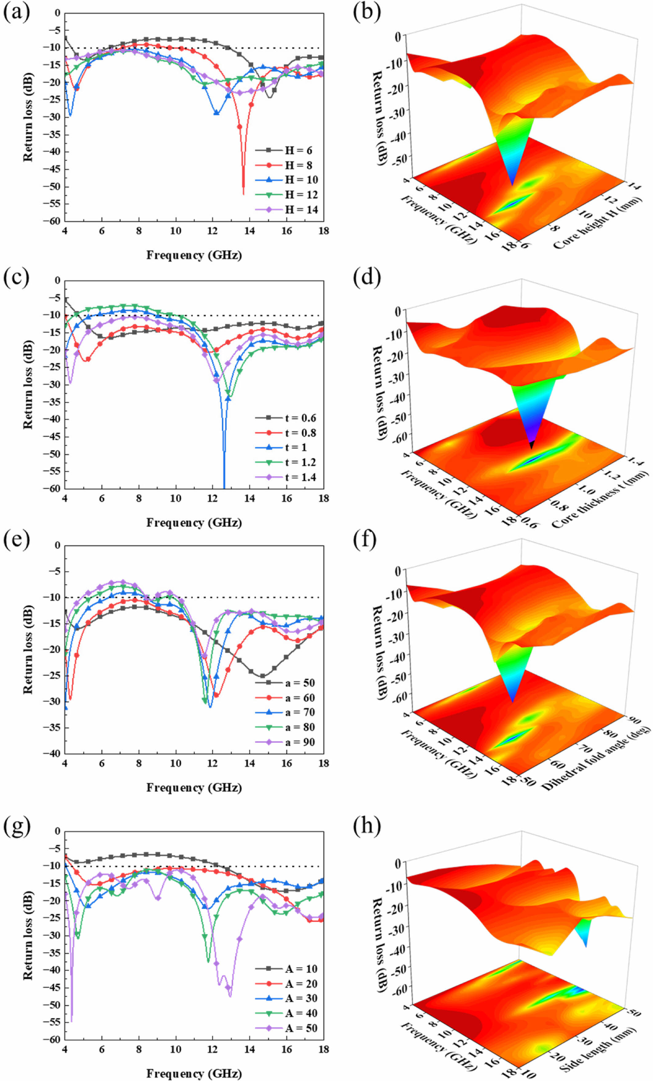 Fig. 6 Return loss result of 3D-printed corrugated core sandwich composites (a, b) core height, (c, d) core thickness, (e, f) dihedral fold angle, (g, h) side length |