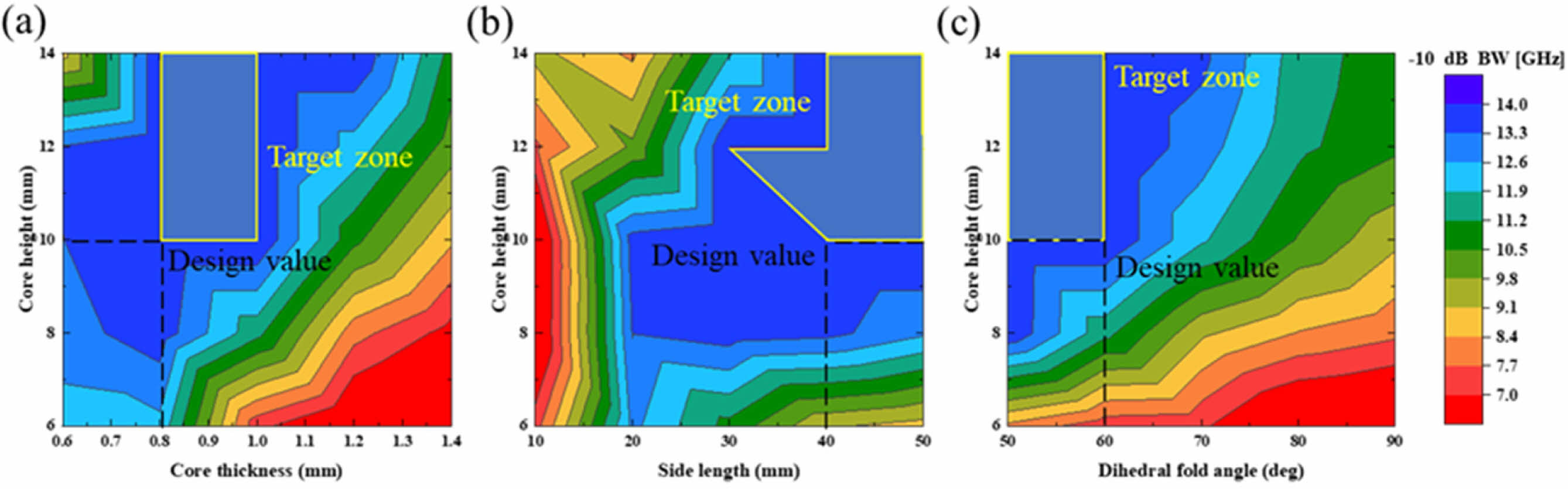 Fig. 7 Simulation results for the variation in -10 dB bandwidth with each design parameter at a fixed core height(a) core thickness, (b) side length, (c) dihedral fold angle |
