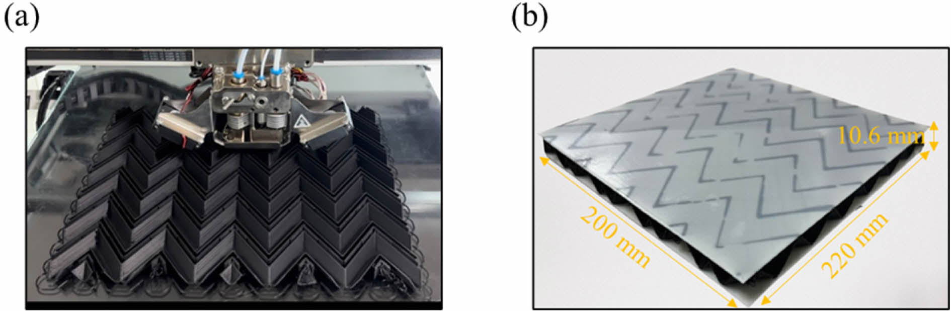 Fig. 10 (a) 3D-Printing fabrication of corrugated core, (b) Result of corrugated core sandwich structure |