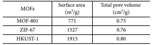 Fig. 3은 합성된 MOF-801, ZIF-67, 그리고 HKUST-1의 결정 구조를 확인하기 위해 수행한 XRD spectra 분석 결과이다. 합성한 MOF-801 XRD spectrum에서는 2θ = 8.5°, 9.9°, 26.0°, 그리고 30.0°에서 피크가 관찰되었으며, 각각 (111), (200), (400), 그리고 (107) 결정면을 나타낸다. 이는 MOF-801의 simulated 패턴의 피크와 일치하는 것으로 확인되었다. 합성한 ZIF-67의 XRD spectrum은 simulated 패턴의 피크와 일치하게 2θ = 7.4°, 10.4°, 12.8°, 그리고 18.0°에서 주요 피크가 나타남을 확인하였으며, 이는 각각 (011), (002), (112), 그리고 (222) 결정면에 해당한다. 합성한 HKUST-1의 XRD spectrum에서는 알려진 주요 피크인 2θ = 6.7°, 9.5°, 그리고 11.5°에서 피크가 관찰되었으며, 이는 (200), (220), 그리고 (222) 결정면과 대응된다. SEM 이미지와 더불어 XRD spectra 측정 결과에서 확인할 수 있듯이, 물 또는 알코올 용매를 사용해 합성한 MOFs가 각 MOFs의 고유한 결정구조를 유지하고, 합성 과정 중 결정상의 변화가 나타나지 않음을 보여준다. 이러한 결과를 통해 기존 합성 공정에 사용되는 DMF 용매를 이용하지 않고, 상온에서 물과 알코올 용매를 이용한 방법으로도 높은 결정성을 지닌 MOFs를 합성할 수 있음을 확인하였다.