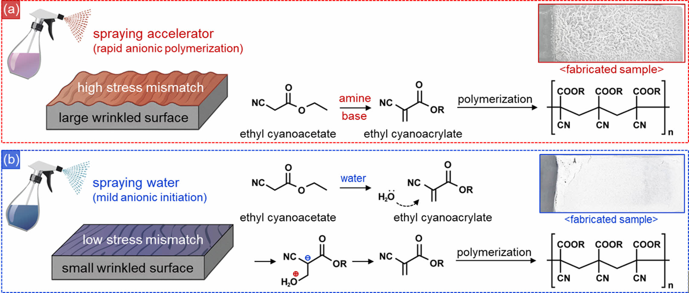 Keywords: 소수성(Superhydrophobicity), 에틸 시아노아크릴레이트(Ethyl cyanoacrylate; ECA), 경화 유도 주름 형성(Curing-induced wrinkling), 경화촉진제(Curing agents)