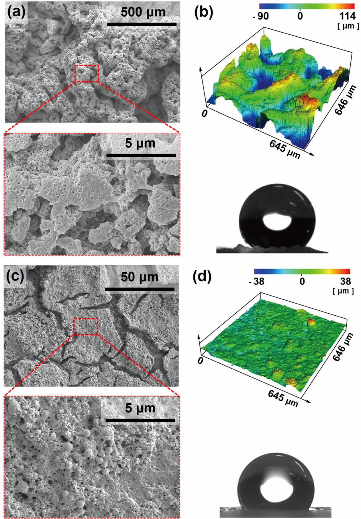 Fig. 2 Surface characterization of ECA cured by different agents. (a) FE-SEM images showing large, hierarchical wrinkle structures formed by the curing accelerator. (b) Corresponding 3D surface profile and high water contact angle. (c) FE-SEM images showing micro-cracks and globular nanostructures formed by water. (d) Corresponding 3D surface profile and lower water contact angle |