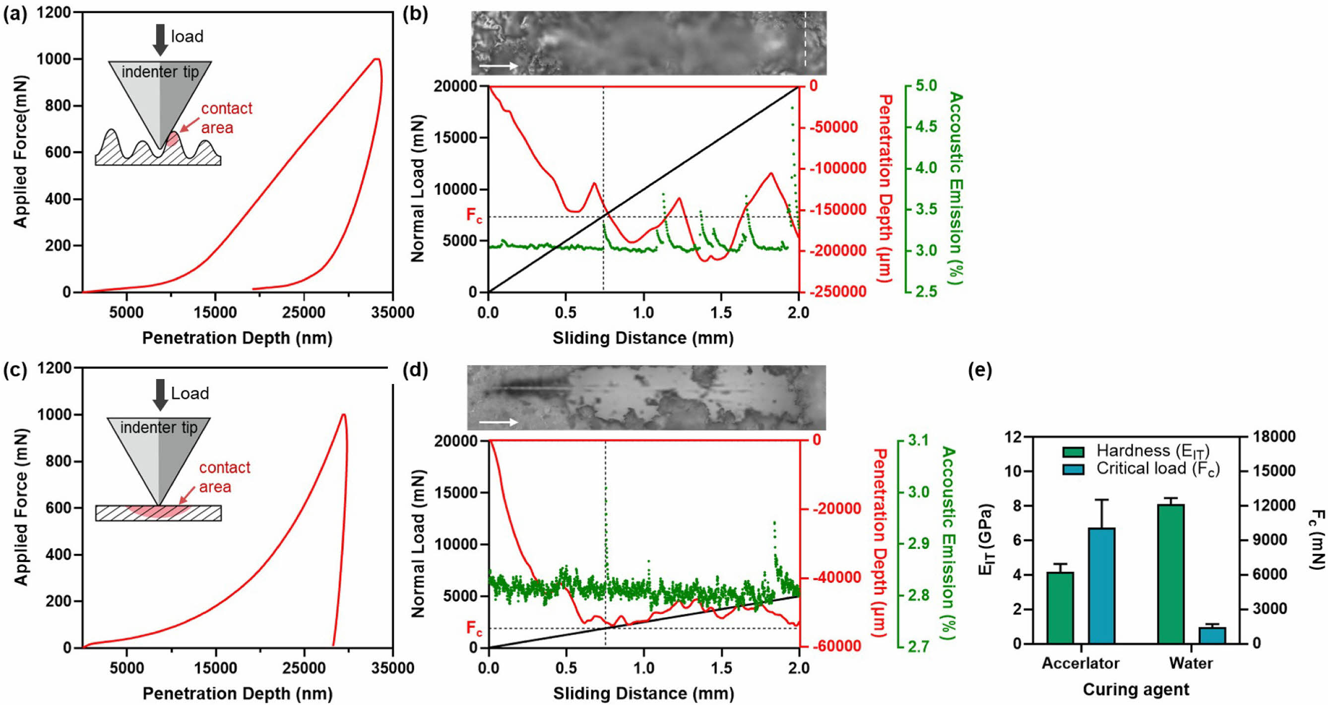 Fig. 4 Mechanical property evaluation of the ECA surfaces prepared with different curing agents. (a) Nanoindentation load-displacement curve and (b) scratch test results (normal load, penetration depth, and acoustic emission) for the surface cured with the accelerator. The inset in (b) shows an optical micrograph of the scratch track. (c) Nanoindentation load-displacement curve and (d) scratch test results for the surface cured with water. (e) A summary chart comparing the indentation modulus (EIT) and critical load (Fc) for both surfaces |