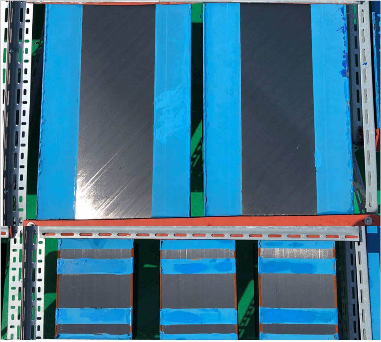시편은 2017년부터 2024년까지 8년간 해안과 100 m 이내 인접한 곳에 설치된 실외 시험소에서 자연환경에 노출시켰다. 해안과 인접한 위치로 인해 고온다습한 해양성 기후의 영향을 지속적으로 받는 지역이며, 시편에는 자외선, 고습도, 강우, 해풍 등 복합적인 환경 인자가 동시에 작용한다. Fig. 3에 제시된 패널 거치용 구조물은 지붕과 측면 차폐가 없는 개방형 구조로 설계되어 바람, 자외선, 습도, 염분 등 외부 인자에 시편이 직접 노출될 수 있는 환경을 제공한다. 또한 시편 고정부에는 갈바닉(galvanic) 부식 방지를 위해 실리콘 코팅을 적용하였고 빗물이나 세척수가 패널 표면에 고이지 않도록 경사진 지지 구조를 설계하였다.