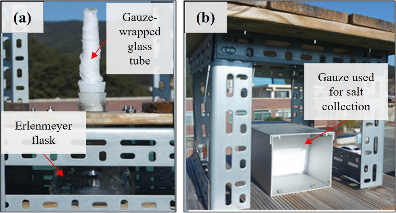 비래염분 측정은 ISO9225[20] 기준에 따라 습식 및 건식 두 가지 방식의 시료 채취법을 병행하여 적용하였다. 두 방식 모두 시편과 동일한 높이에 설치하였으며 1개월 간격으로 시료를 회수하여 분석하였다.