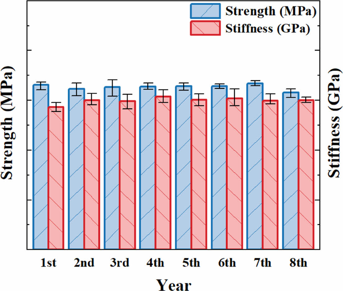 적층판 인장 시험을 통해 기준년도부터 8차년도까지의 연차별 기계적 특성 변화를 분석하였다. 시험 결과는 Fig. 8에 나타내었다. 인장 강도는 기준 연차 대비 ±2% 범위 내에서 7차년도까지 큰 변화가 없었으며, 8차년도에는 약 5% 감소하였다. 인장 강성은 기준 연차 대비 ±3% 범위 내에서 유지되어 통계적으로 유의미한 변화는 관찰되지 않았다. 강도와 강성 모두 장기간 자연환경 노출에도 비교적 안정적인 특성을 나타냈다.