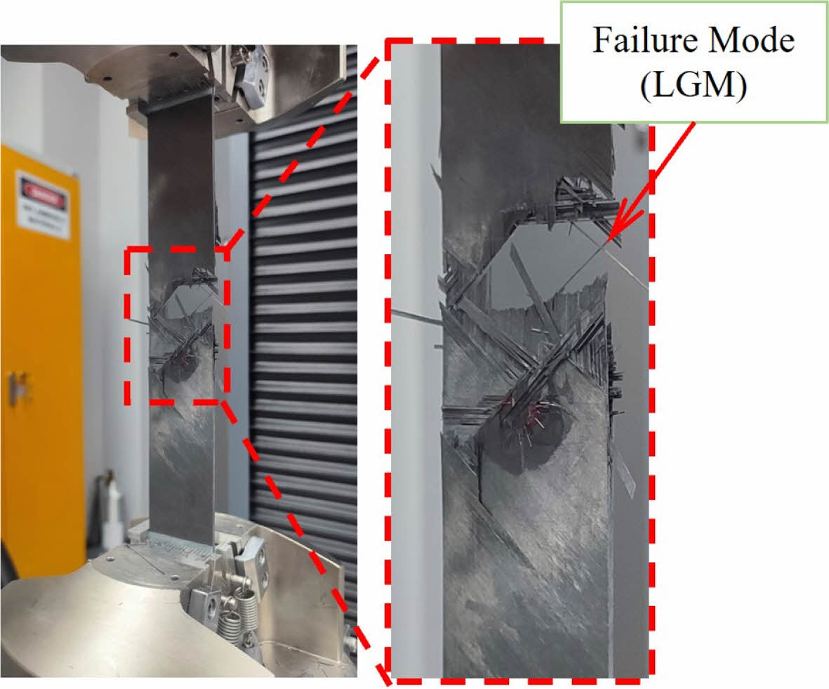 모든 연차 시편에서 유사한 파손 모드가 반복적으로 관찰되었으며, 대표적인 파손 모드는 Fig. 9에 나타내었다. 관찰된 파손 모드는 ASTM D5766[25]에서 정의하는 LGM(lateral gage middle)으로 발생하였으며, 이는 인장 하중에 따른 전형적인 섬유 지배형 인장 파손 모드이다. 이러한 결과는 장기간 자연환경 노출 후에도 복합재의 섬유층이 기계적 건전성을 효과적으로 유지하고 있음을 의미한다.