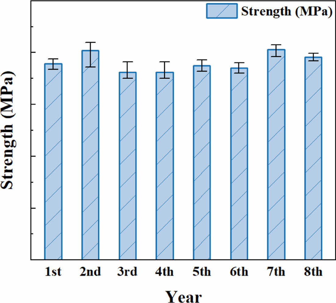 오픈홀 압축 시험을 통해 기준년도부터 8차년도까지의 연차별 압축 강도를 비교 분석하였다. 시험 결과는 Fig. 10에 나타내었다. 압축 강도는 기준 연차 대비 ±5% 범위 내에서 전반적으로 안정적으로 유지되었으며, 3차년도와 4차년도 시편에서는 일시적으로 약 10% 수준까지 감소하였으나 이후 연차에서는 다시 기준년도 수준에 근접한 값을 회복하였다. 연차별 편차는 일부 관찰되었으나, 전반적인 경향을 볼 때 압축 강도는 뚜렷한 열화 경향 없이 비교적 일정한 수준을 유지한 것으로 판단된다.