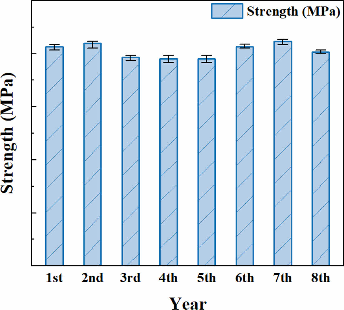 층간전단 시험을 통해 연차별 전단 강도를 비교 분석하였으며, 결과는 Fig. 14에 나타내었다. 전단 강도는 전체적으로 기준 연차 대비 ±10% 이내의 범위에서 안정적으로 유지되었으며, 8차년도 시편에서는 약 5% 수준으로 증가하였다. 연차 간 뚜렷한 변화는 관찰되지 않았으며, 이는 장기간 자연환경에 노출되었음에도 층간 계면의 접착 특성에 급격한 열화가 발생하지 않았음을 시사한다.