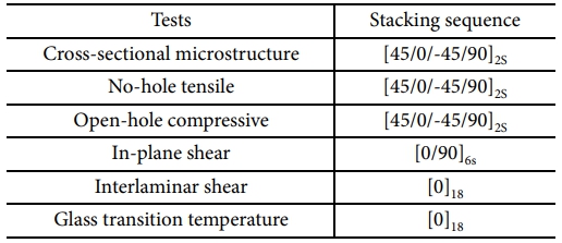 총 8년간의 단면 구조 관찰, 인장, 오픈홀 압축, 면내전단, 층간전단 강도와 Tg 측정을 위한 총 여섯 종류의 패널을 제작하였다. 모든 패널은 Table 1에 제시된 적층 순서에 따라 Hexcel 社의 IM7 프리프레그를 손으로 적층하였다. 적층판 상부에는 추가로 유리섬유층(Glass barrier)과 표면필름(surface film)을 적층하였다. 유리섬유층은 복합재 내부로의 수분 및 오염원 침투를 차단하고 장기간 자연환경 노출 시 계면 보호를 위해 사용하였고 표면필름은 외부 환경에 대한 1차 방어층 역할을 수행한다.