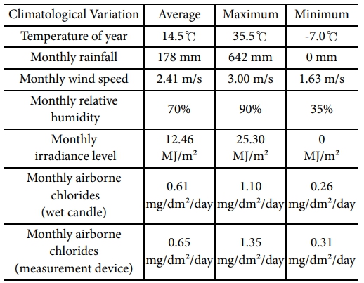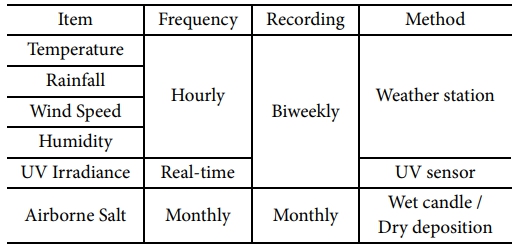 자연환경 노출 조건의 정량적 분석을 위해 기상청 통계 자료와 현장에 설치된 측정 장비를 활용하여 환경 데이터를 수집하였다. 온도, 습도, 풍속, 강우량은 시편 위치로부터 약 3 km 떨어진 통영기상대의 데이터를 사용하였고 자외선 및 비래염분은 현장에 설치된 장비를 통해 측정하였다. 측정 항목, 주기 및 방법은 Table 2에 나타내었다.