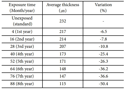 단면 구조 관찰 결과, 가장 외부에 위치한 보호층인 표면필름은 4차년도부터 점진적인 열화가 시작되어, 초기 두께 약 170 μm에서 8차년도에는 약 60 μm 수준까지 감소하였다. 반면, 중간 층인 유리섬유층은 8년간의 노출 기간 동안 구조적 손상 없이 약 60 μm의 두께를 안정적으로 유지되었다.