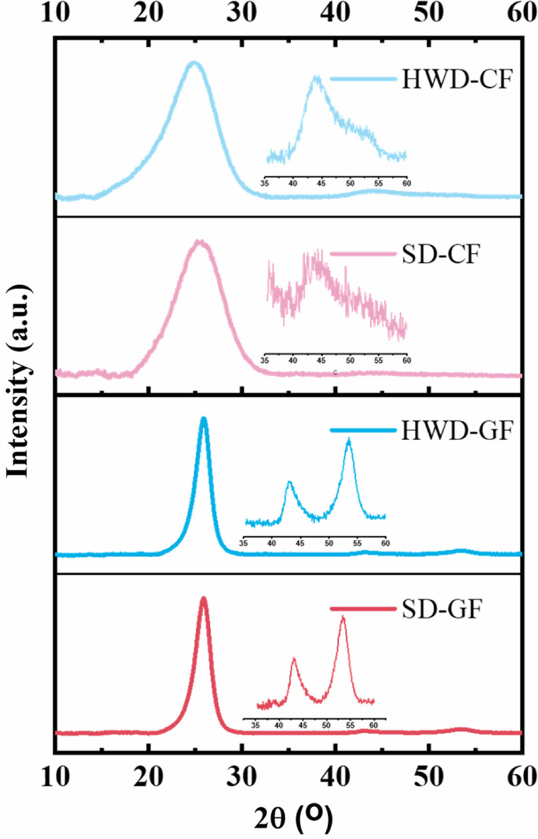 Fig. 3 XRD patterns of carbon and graphitized fibers (HWD-CF, SD-CF, HWD-GF, and SD-GF) |
