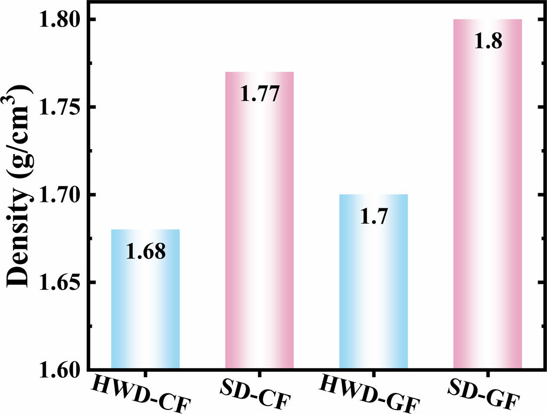 Fig. 5 Density comparison of carbon and graphitized fibers (HWD-CF/GF and SD-CF/GF) |