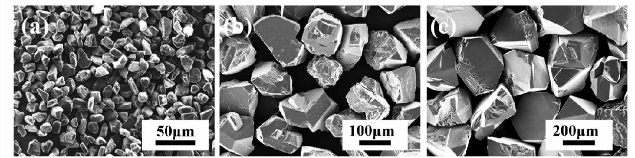 Fig. 1 SEM micrographs of cubic boron nitride powders with different particle size: (a) 15 μm, (b) 100 μm (c) 300 μm |